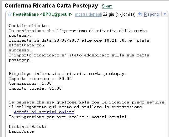 Phishing Poste Italiane: "...ricarica postepay avvenuta con successo."