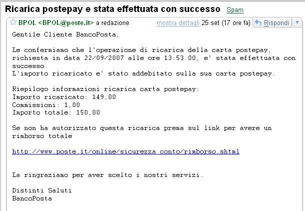 Phishing Poste Italiane: Ricarica postepay e stata effettuata con successo