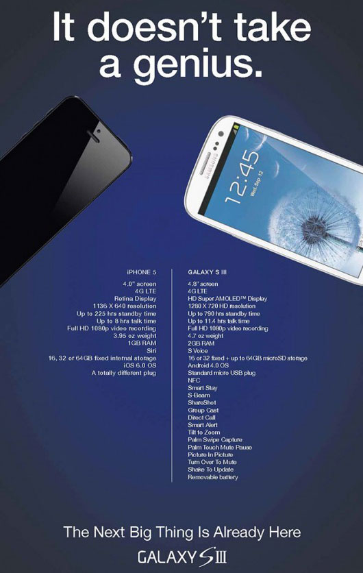 Samsung ha lanciato una nuova campagna pubblicitaria che prende in giro Apple e il nuovo iPhone 5: "Non ci vuole un genio per scegliere," dice Samsung.