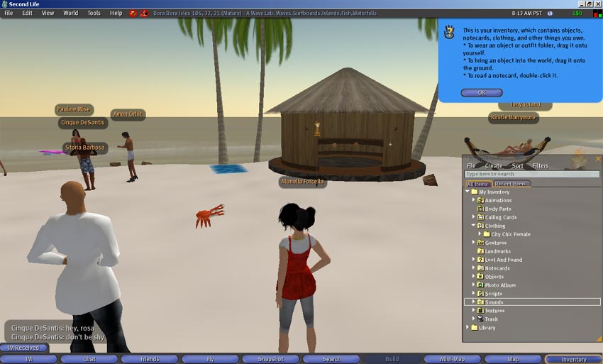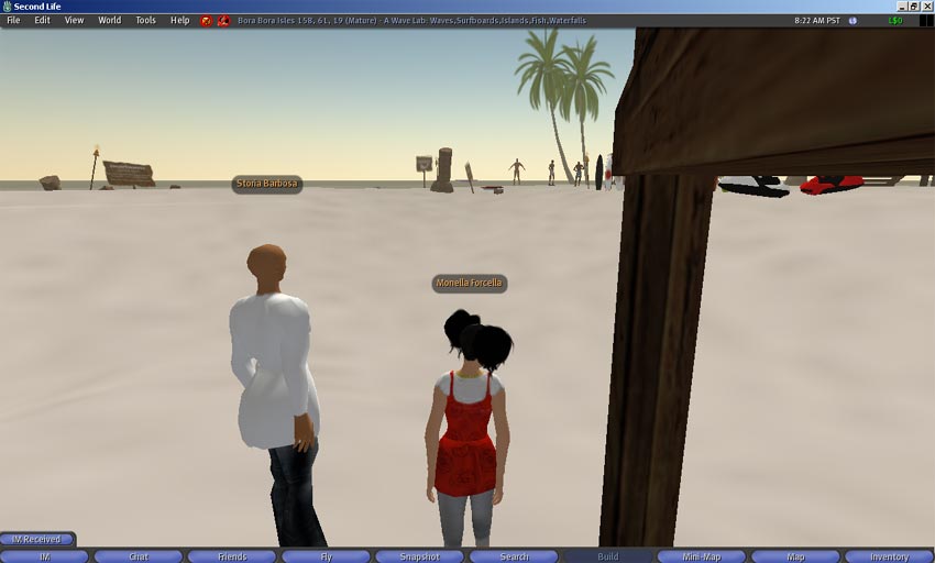 Bora Bora, Polinesia. Beh non so se avete mai avuto la fortuna di andarci ma anche solo a guardarla in foto capite di che parlo. Mare da sogno, spiaggia finissima, palafitte come case... beh devo dire che in Second Life l'isola è riprodotta assai bene! La spiaggia c'è, sabbia finissima, surfisti pronti a catturare l'onda, radio a manetta, case/palafitte alcune anche libere ma i due per l'ennesima volta si sono ricordati di non avere Linden Dollar :(