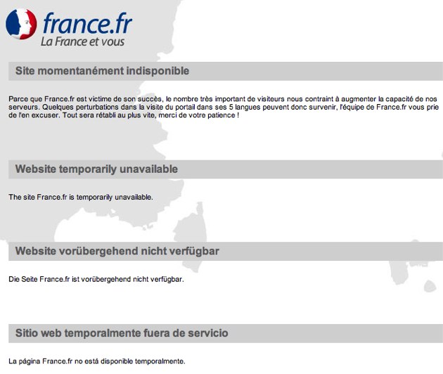 È invece notizia di questi giorni il lancio di france.fr (l'equivalente del nostro famigerato italia.it), il portale multilingua del Ministero del Turismo Francese. Sito appena lanciato e già non funzionante. Almeno il nostro funzionava: ci era costato come il PIL di un piccolo stato centro-Americano, ma funzionava.