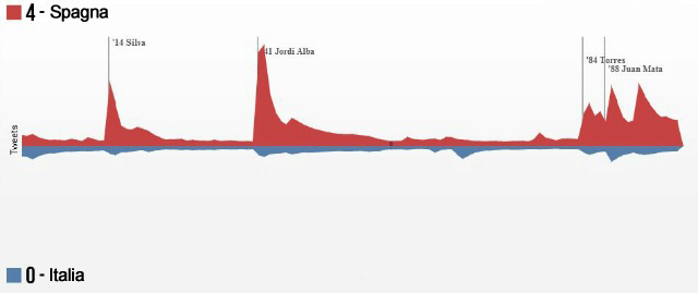 Gli utenti di Twitter hanno inviato più di 15.000 tweet al secondo quando la Spagna ha segnato il quarto goal all'Italia, Domenica sera durante le finali dei campionati Europei di calcio: un nuovo record per un evento sportivo. I tweet riguardanti la Spagna hanno però raggiunto il loro picco dopo il secondo goal.